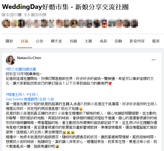 但是找到小吉是我最正確的決定!! 小吉會在婚禮前了解她的新人,細心地確認相關細節,並主動和你聯繫,相約面談的地點,再面談的時候,會詳細的確認流程給予建議,細心的是還會根據你的城市找好咖啡廳嗚嗚。帶著電腦的她,會主動把你所需要的資訊都記錄下來,並且用LINE在提醒你還有甚麼代辦事項,甚至還會根據你的歌單幫你重新審視歌詞、準備音樂檔案,還自備電腦幫忙撥放音樂,這麼感人的主持人要去哪裡找![]()
